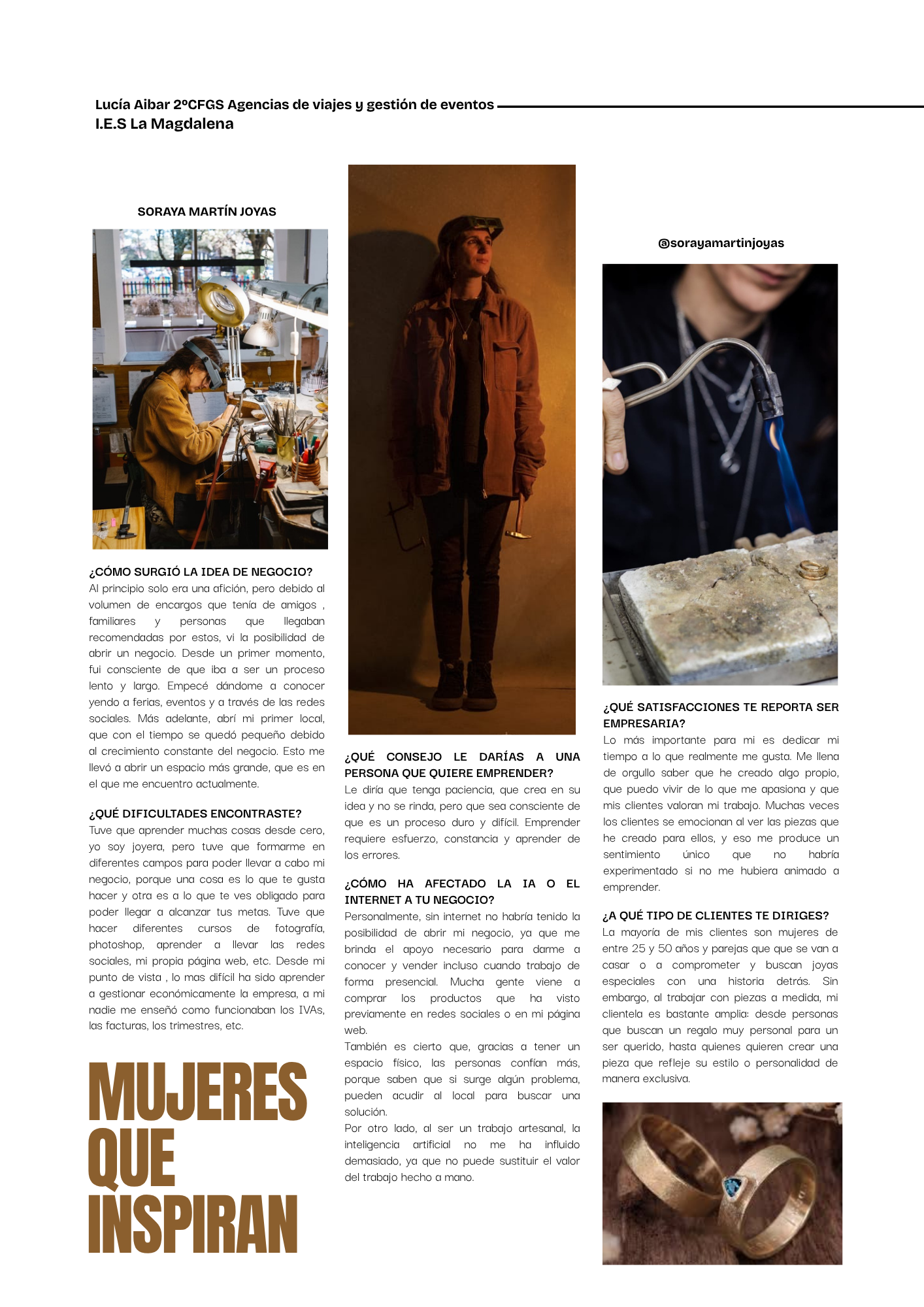 A continuación os compartimos entrevistas realizadas a mujeres emprendedoras por los estudiantes de 2º de los CFGS de Agencia de Viajes y Gestión de Eventos y Guía, Información y Asistencia Turística.